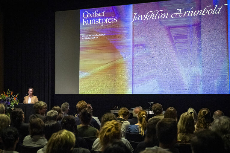 Die KHM feierte am 16. Juli ihr 35-jähriges Bestehen mit einem Festprogramm zum diesjährigen Rundgang. Nach den Grußworten von Prorektorin Solveig Klaßen, von Kölns Bürgermeister Andreas Wolter und vom Rektor Prof. Mathias Antlfinger sprach der Medien- und Kulturphilosoph Prof. Dr. Roberto Simanowski über „Algorithmic Reparation. Wie Sprachmodelle die Welt verbessern wollen und was sie dabei von der Kunst lernen können.“ Es folgte eine Performance von Chanmin Kim, Student an der KHM. ImAnschluss verlieh Isabel Apiarius-Hanstein, Vorstandsvorsitzende der Freunde der KHM e.V., den mit 7.500 Euro dotierten Großen Kunstpreis an die KHM-Absolventin Javkhlan Ariunbold.