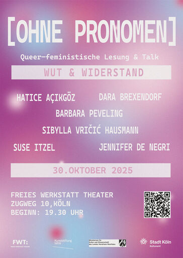 [OHNE PRONOMEN] ist eine Literaturplattform für queer-feministische und intersektionale Inhalte, die sich kritisch mit normativen Strukturen auseinandersetzt. Sie wurde 2022 von den KHM-Absolventinnen Leonie Hoh, Suse Itzel und Jennifer de Negri gegründet. Die Köln-Premiere fand 2023 mit Unterstützung der Kunsthochschule für Medien Köln im Freien Werkstatt Theater  statt.