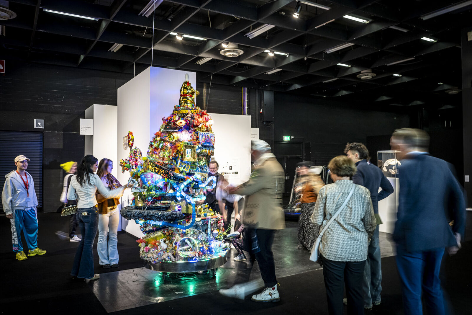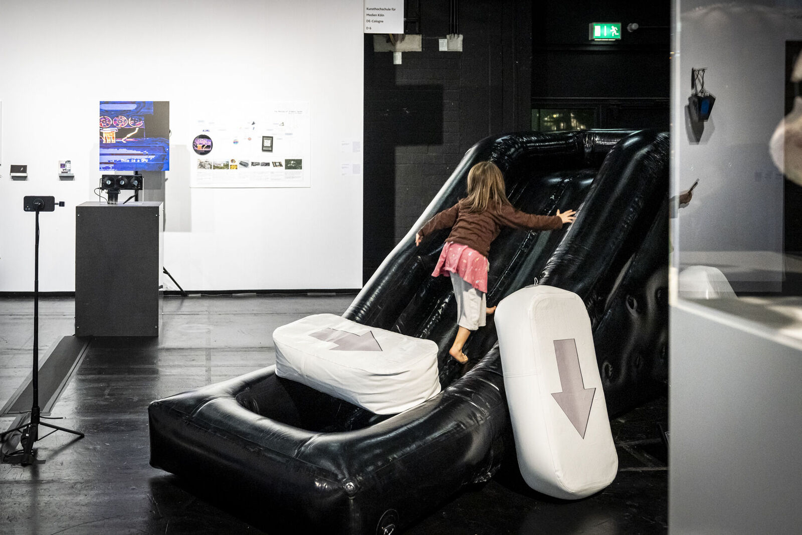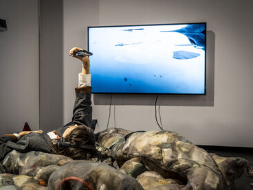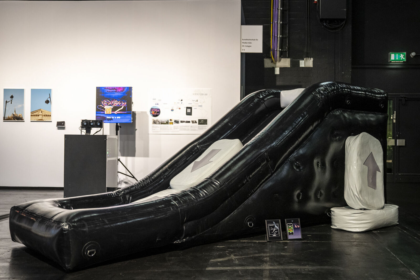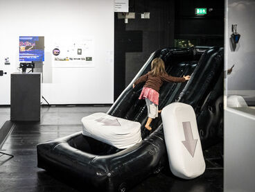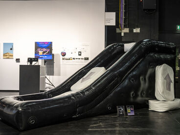 Mit „ACID Ranch 2.0“ (2020-2025) lädt Emil Adam das Publikum zur Interaktion mit einem überlebensgroßen Diorama aus Spielzeugen und Technikkomponenten ein. Während hier die spielrische (Über-)Stimulation der Körper und Sinne durch Lichter, Sounds und haptische Funktionen im Vordergrund steht, macht Blanca Barbat in ihrer Videoinstallation „The body as a threshold“ (2025, 15 Min.) Moment der Trauer, Verstrickung und Verantwortung spürbar angesichts der existenziellen Bedrohung von Lebewesen durch Plastikmüll in den Weltmeeren. Alexandra Lex Nikitina imaginiert mit „Armored Bjära“ (2024) eine keramische Rüstung für eine phantastische künstliche Kreatur, ähnlich zerstörerisch wie die robotisierten Waffen in globalen Konflikten. Wie formen materielle Beschränkungen, algorithmische Logik und politische Infrastrukturen ästhetische Qualitäten? Dieser Frage geht Tin-Chun Liu in seiner Installation „Heat Generator“ (2025) nach, einer Rückkopplungsmaschine, die sowohl Wärme als auch bewegte Bilder erzeugt. Die performative Installation „Movement 504“ von Conrad Weise und Kjell Wistoff bildet dreidimensional im Maßstab 78:1 die „Slide to Unlock”-Oberfläche von Apple aus aufblasbarem PVC nach. Als buchstäbliche Rutsche konzipiert bietet sich die Möglichkeit, die patentierte „Movement 504”-Geste mit dem gesamten Körper auszuführen. Maja Funkes künstlerische Arbeiten wiederum entstehen in Synergie mit ihrem elektronischen Umfeld und finden ihre Form in multimedialen Übersetzungen und investigativen Performances, wie in „Réalisée au titre du droit“ (2024), die letztes Jahr in Paris stattgefunden hat.