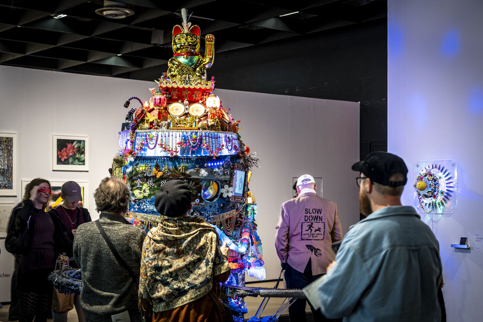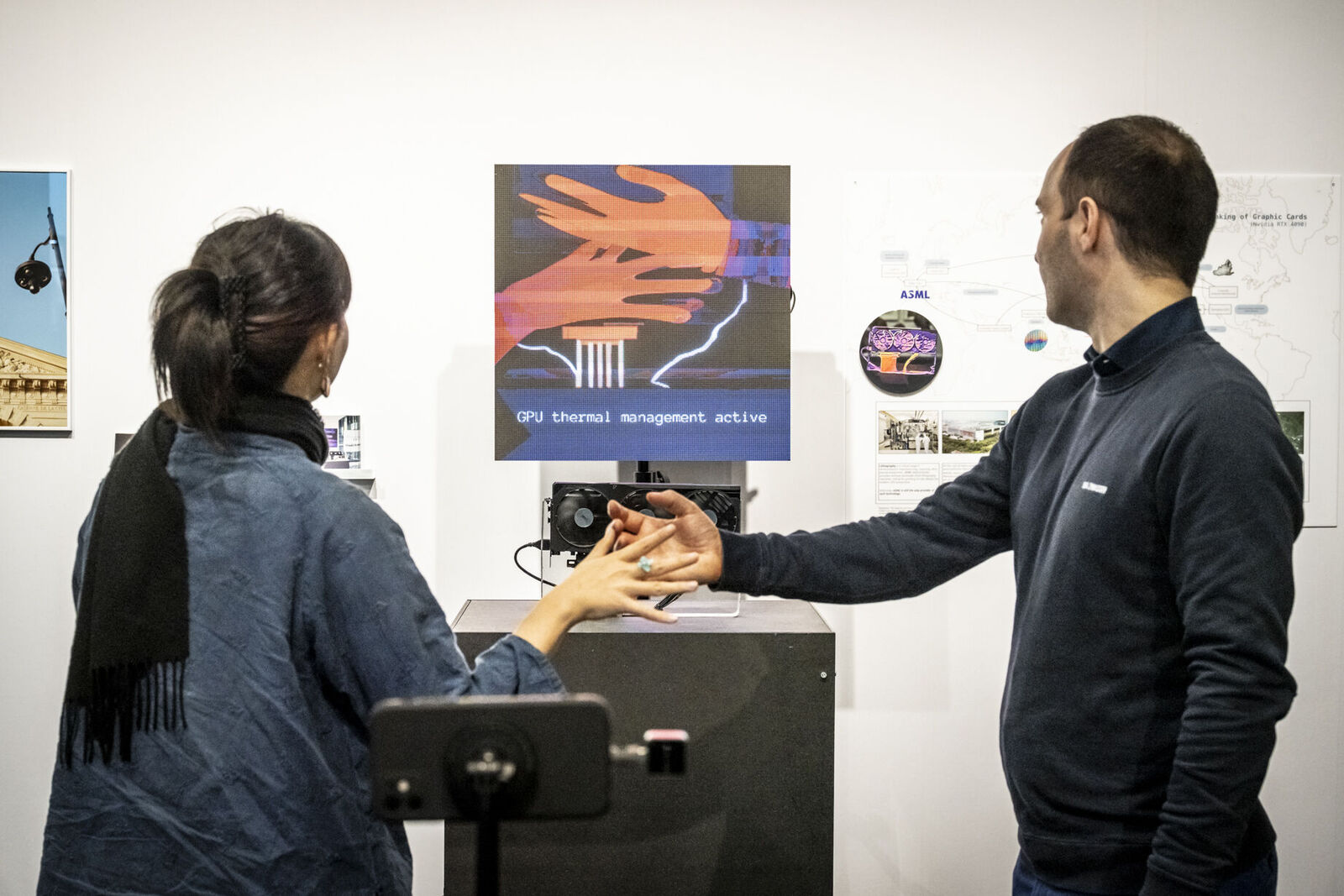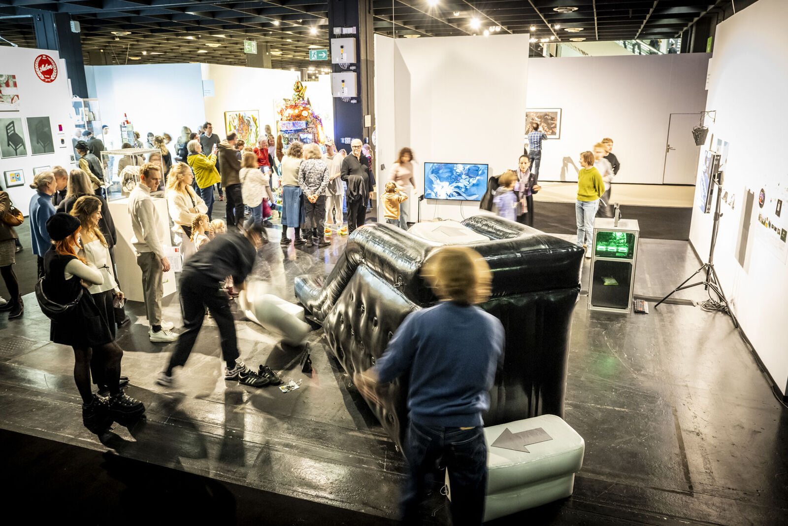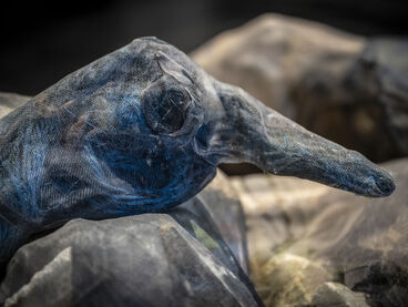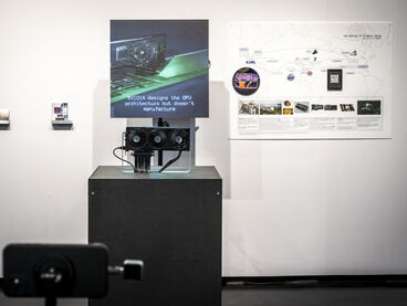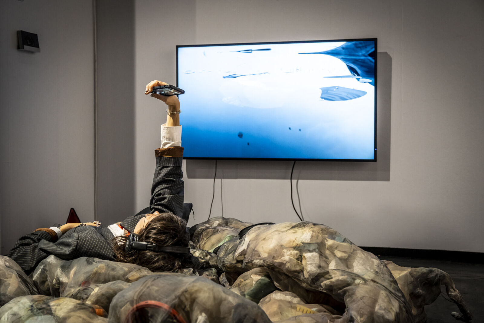 Mit „ACID Ranch 2.0“ (2020-2025) lädt Emil Adam das Publikum zur Interaktion mit einem überlebensgroßen Diorama aus Spielzeugen und Technikkomponenten ein. Während hier die spielrische (Über-)Stimulation der Körper und Sinne durch Lichter, Sounds und haptische Funktionen im Vordergrund steht, macht Blanca Barbat in ihrer Videoinstallation „The body as a threshold“ (2025, 15 Min.) Moment der Trauer, Verstrickung und Verantwortung spürbar angesichts der existenziellen Bedrohung von Lebewesen durch Plastikmüll in den Weltmeeren. Alexandra Lex Nikitina imaginiert mit „Armored Bjära“ (2024) eine keramische Rüstung für eine phantastische künstliche Kreatur, ähnlich zerstörerisch wie die robotisierten Waffen in globalen Konflikten. Wie formen materielle Beschränkungen, algorithmische Logik und politische Infrastrukturen ästhetische Qualitäten? Dieser Frage geht Tin-Chun Liu in seiner Installation „Heat Generator“ (2025) nach, einer Rückkopplungsmaschine, die sowohl Wärme als auch bewegte Bilder erzeugt. Die performative Installation „Movement 504“ von Conrad Weise und Kjell Wistoff bildet dreidimensional im Maßstab 78:1 die „Slide to Unlock”-Oberfläche von Apple aus aufblasbarem PVC nach. Als buchstäbliche Rutsche konzipiert bietet sich die Möglichkeit, die patentierte „Movement 504”-Geste mit dem gesamten Körper auszuführen. Maja Funkes künstlerische Arbeiten wiederum entstehen in Synergie mit ihrem elektronischen Umfeld und finden ihre Form in multimedialen Übersetzungen und investigativen Performances, wie in „Réalisée au titre du droit“ (2024), die letztes Jahr in Paris stattgefunden hat.