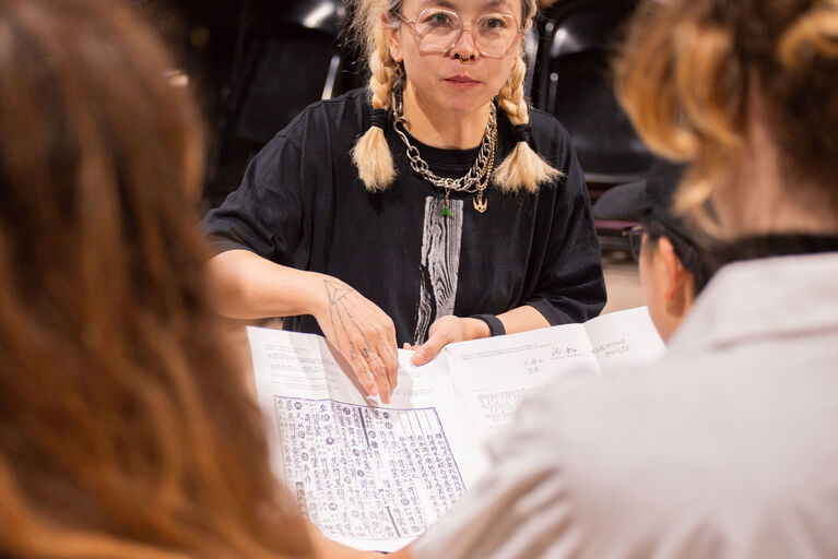 Mit dieser Notationslogik als Rahmen für strukturierte Improvisation entwickeln wir in Kleingruppen gemeinsame Verfahren der Neuinterpretation und des Modellierens. Die entstehenden Muster werden zu kollektiven klanglichen und gestischen Texturen – mit Stimme, Bewegung und einfachen Piezo-Elementen, begleitet von Videoprojektionen und Zeichnungen als überlagernde Spuren.